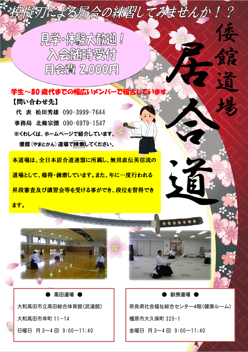 奈良県橿原市・大和高田市で、居合(無双直伝英信流)の練習を行っている「倭館道場 畝傍剣誠会」(やまとかんどうじょう・うねびけんせいかい)です。